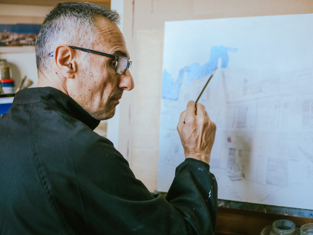 La trayectoria de Pep Encinas se sostiene en el oficio, en la repetición y en una mirada que se ha ido afinando con los años. Su estudio es un espacio de trabajo diario, de evolución lenta y de compromiso con la pintura como práctica. Ese mismo entorno acompaña el crecimiento del hijo, que observa, aprende y entiende la madurez del proceso creativo desde dentro.